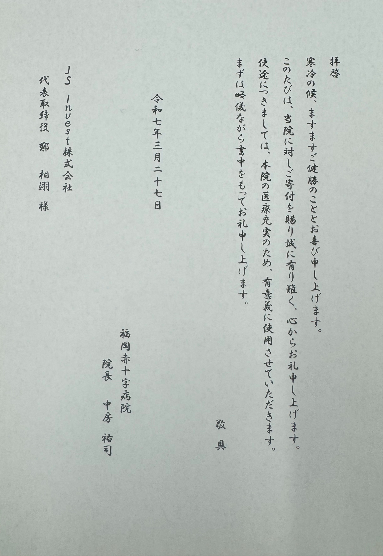 - 福岡赤十字病院に金100万円寄付